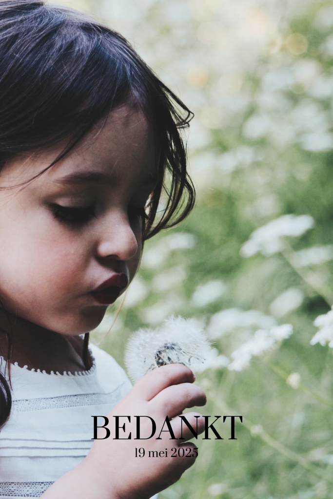 Bedank de gasten bij de communie van jullie dochter met dit persoonlijke kaartje, een mooi aandenken! Op de voorkant is plaats voor een eigen foto en staat de tekst 'bedankt' afgebeeld in moderne typografie. De achterkant is in zacht roze lila met een mooie witte lijntekening van takjes, hier kan een persoonlijke tekst worden toegevoegd.