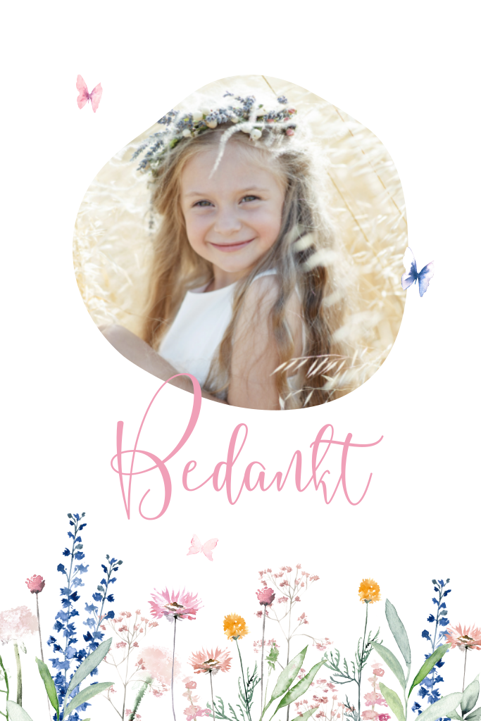 Schattig bedankkaartje voor de communie van een meisje! Op het witte kaartje staat aan de onderkant op voor- en achterzijde een rand van kleurrijke veldbloemen in roze, blauw en geel. In de organische vorm kan een eigen foto worden geplaatst, er naast leuke vlindertjes. De teksten zijn in zwart en roze in verschillende hippe lettertypes.