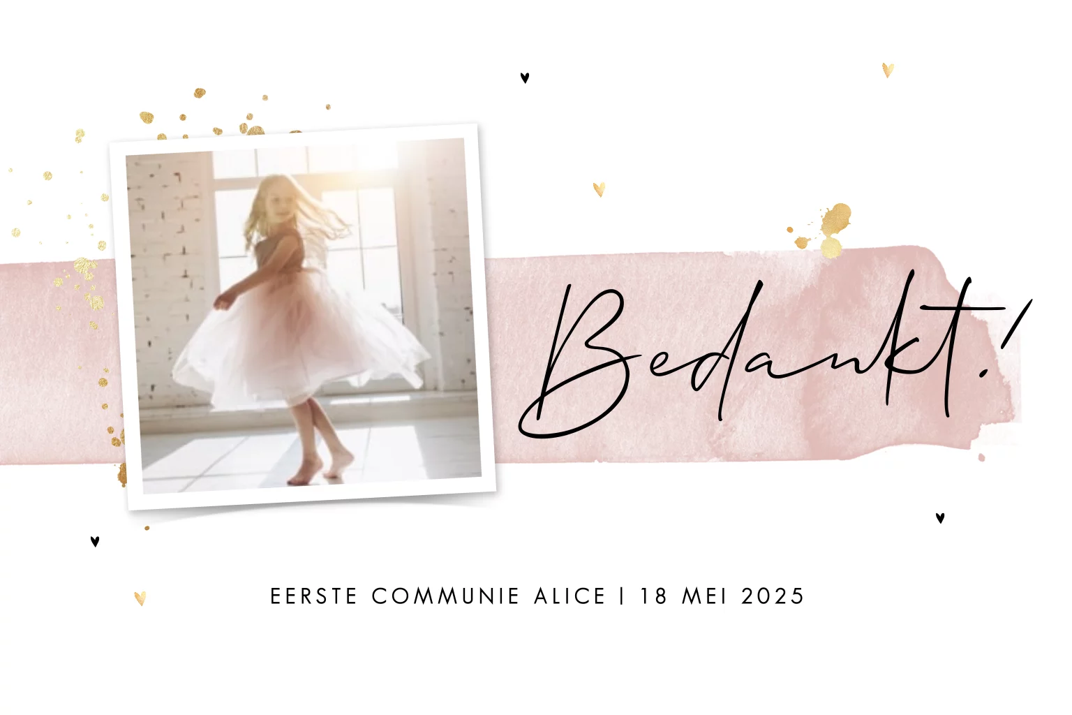 Wauw, wat een superlief bedankkaartje voor de communie van een meisje! Op de witte achtergrond staat een roze aquarelstreep, waarop een foto is geplaatst met ernaast de tekst 'bedankt'. Eronder is ruimte om de naam en de datum in te voegen. De goudkleurige spetters maken het kaartje extra feestelijk. Op de achterkant staat de tekst in hippe letters met onderaan de naam weer op een lichtroze waterverfstreep, mooi!