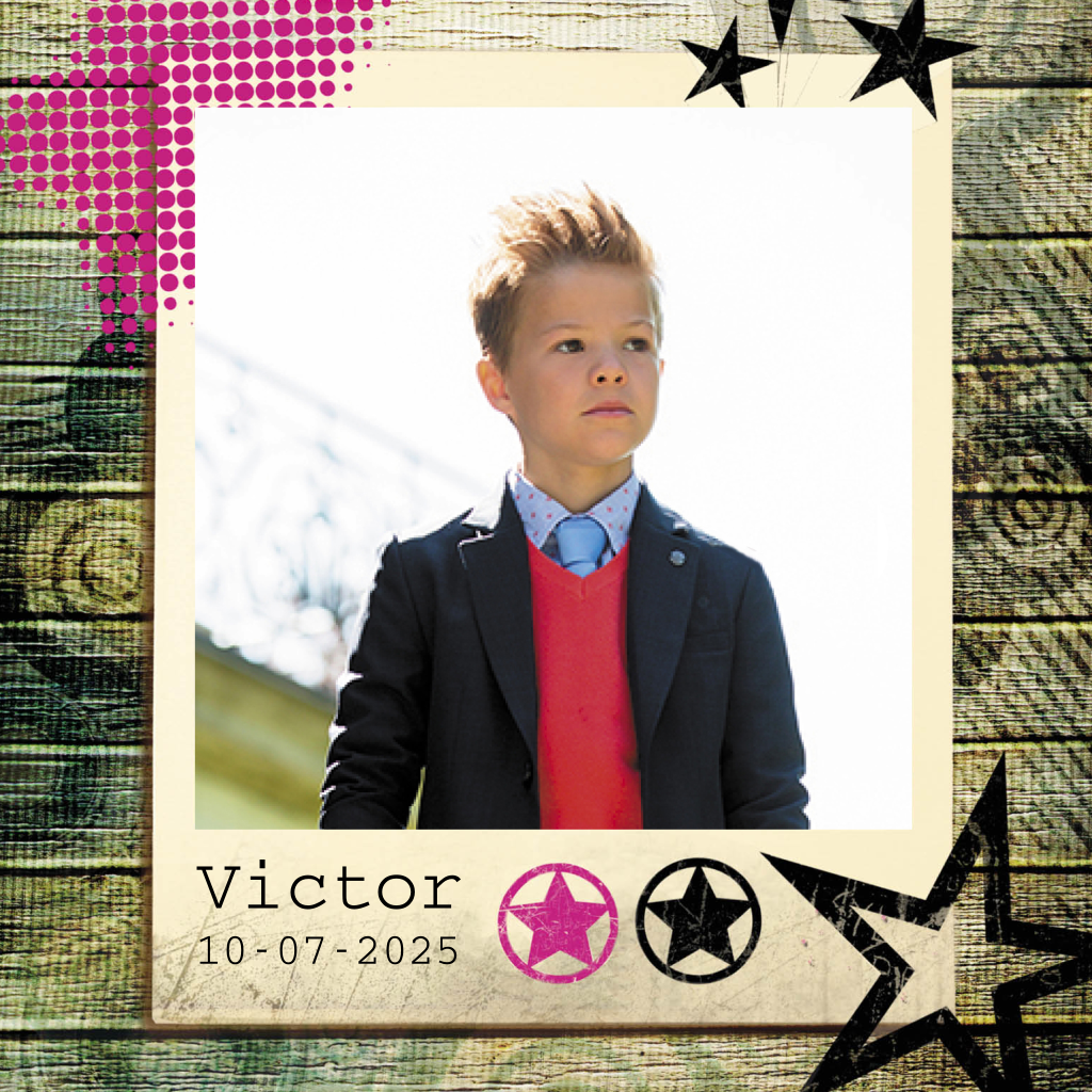 Originele jongens bedankkaart voor de communie die je naar je vrienden en familie kunt sturen. Met stoere elementen zoals houten achtergrond en sterretjes in felle kleurtjes, de achterkant is bij dit voorbeeld limegroen. Pas alle teksten en kleuren aan naar eigen smaak en plaats op de voorkant een foto van je zoon.