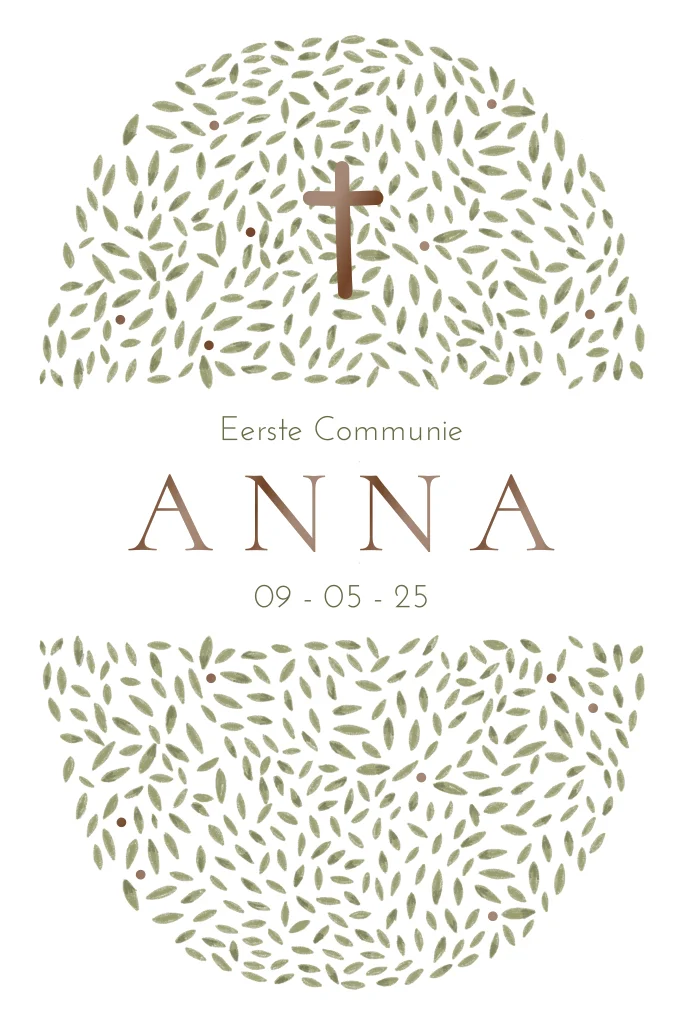 Mooie uitnodiging communie in de vorm van een ovaal met een patroon van lichtgroene blaadjes. Op de uitsparing op de witte kaart staat de naam in hoogglans, ook het kruis erboven is in hoogglans. Op de achterkant kun je een leuke eigen foto uploaden, maak de kaart persoonlijk in de online editor.