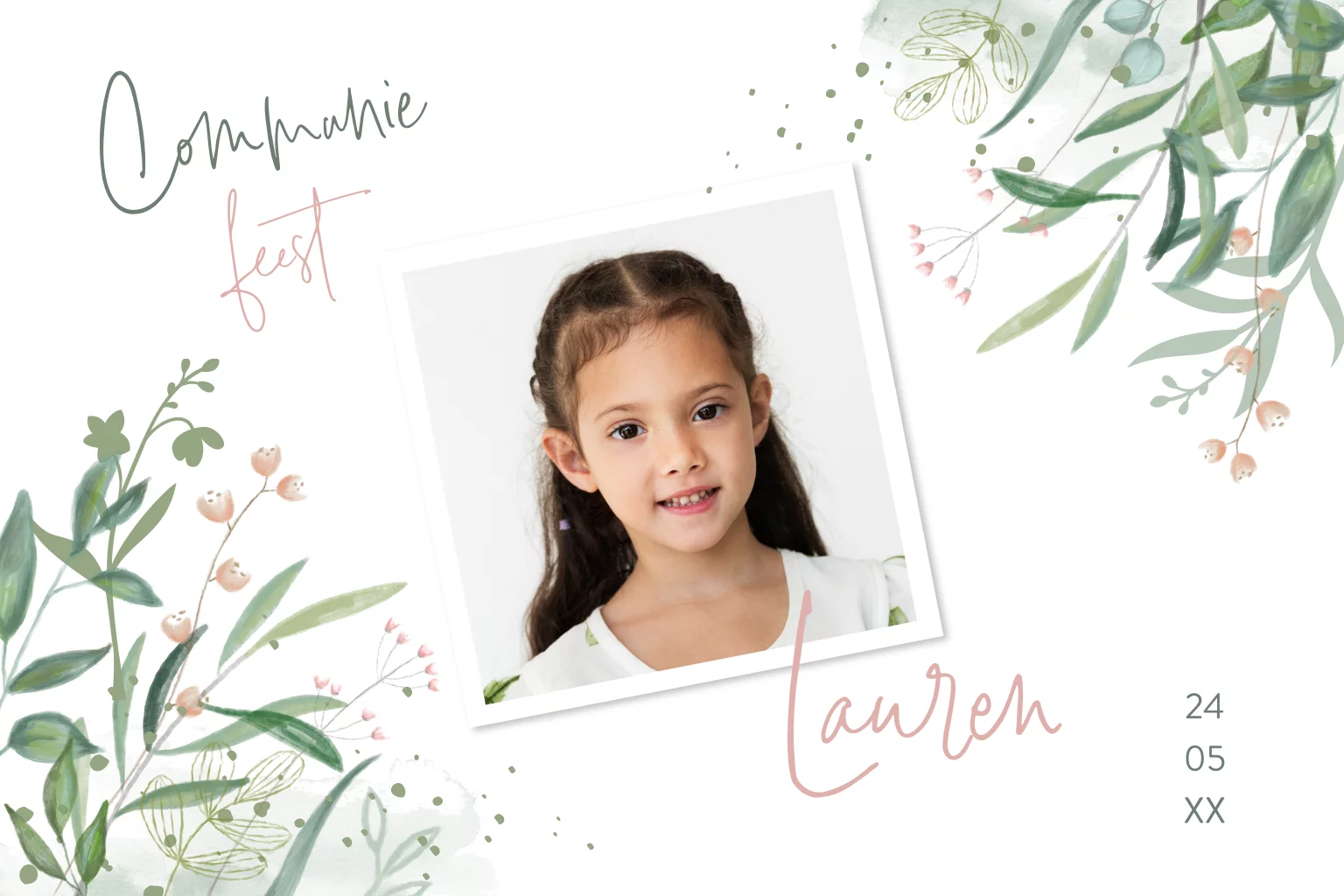 Prachtige en unieke uitnodiging met een eigen foto voor een communie/lentefeest. Op deze communiekaart staan naast een eigen foto, getekende bloemen en blaadjes in groene en roze tinten. In de editor kun je de tekst naar wens aanpassen.