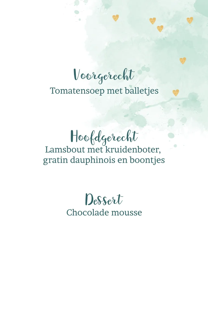 Menukaart met mintgroene aquarel en hartjes