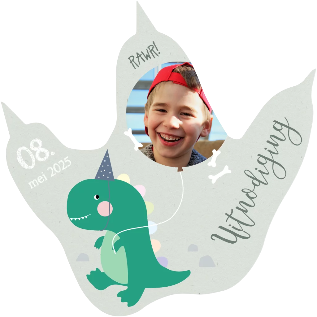 Is jullie zoontje ook gek op dino's? Stuur dan deze coole uitnodiging voor de communie in de vorm van een dinopoot naar familie en vrienden. Het kaartje is in verschillende kleuren groen en bovenaan kun je een leuke foto downloaden, maak de kaart persoonlijk in de online editor.
