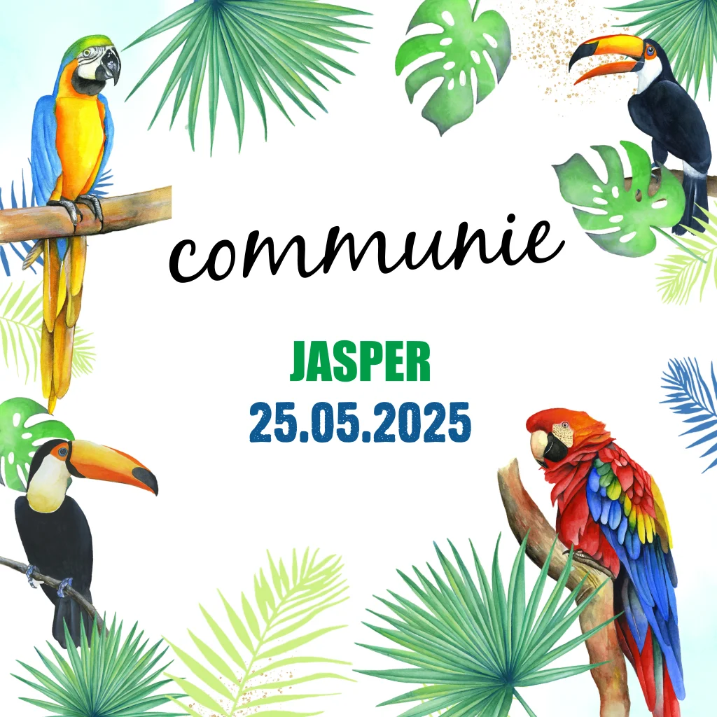 Deze tropische communiekaart is super hip en vrolijk met de papegaaien en toekans tussen botanische bladeren. Deze kleurrijke kaart kun je gemakkelijk aanpassen in de online editor.