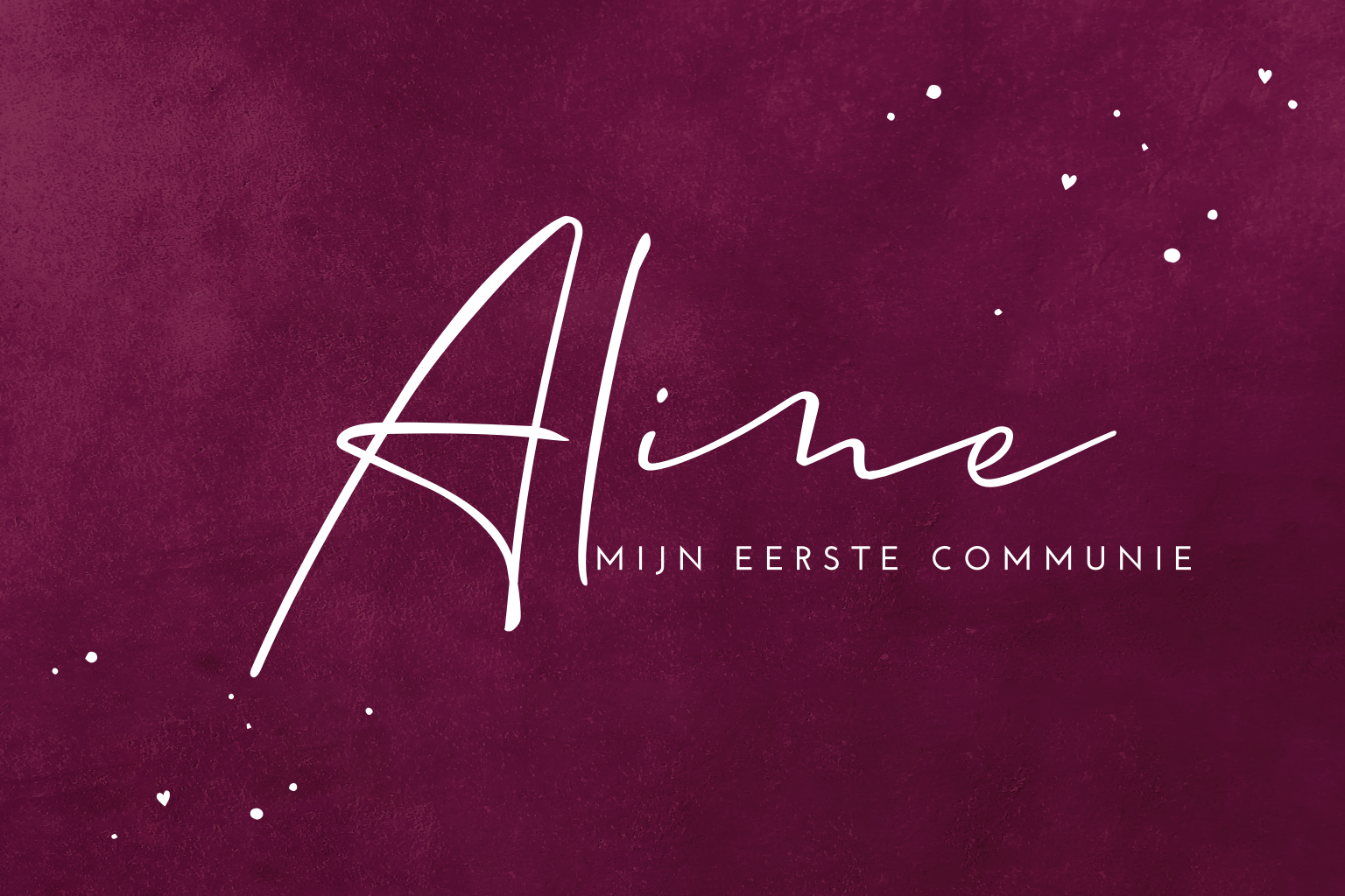 Stijlvol communiekaartje in aubergine kleur met tekst in roségoudfolie, waardoor je een mooi contrast krijgt. In de hoeken van dit velvet-look kaartje staan hartjes en spetters in roségoudfolie, pas de tekst naar wens aan in de online editor.
