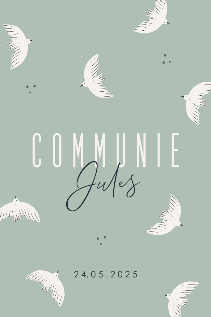 Wat een leuke uitnodiging voor de communie van jullie zoon! De witte duiven staan op een mooie blauwe achtergrond. De tekst kan gemakkelijk in de editor worden aangepast.