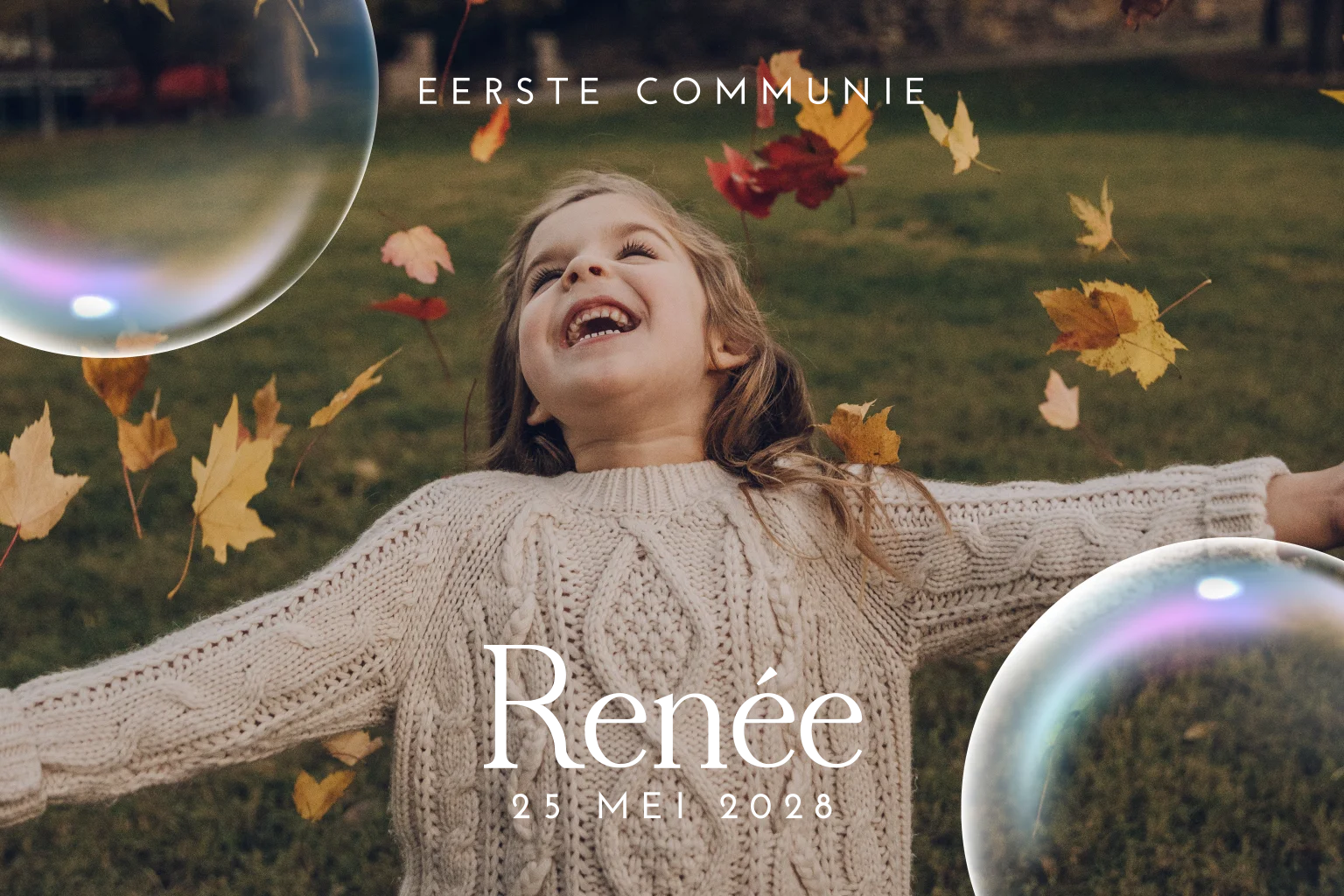 Vrolijke uitnodiging communie met ruimte om een eigen foto te uploaden. De tekst is in holografische folie, dat past mooi bij de leuke belleblaas bubbels!