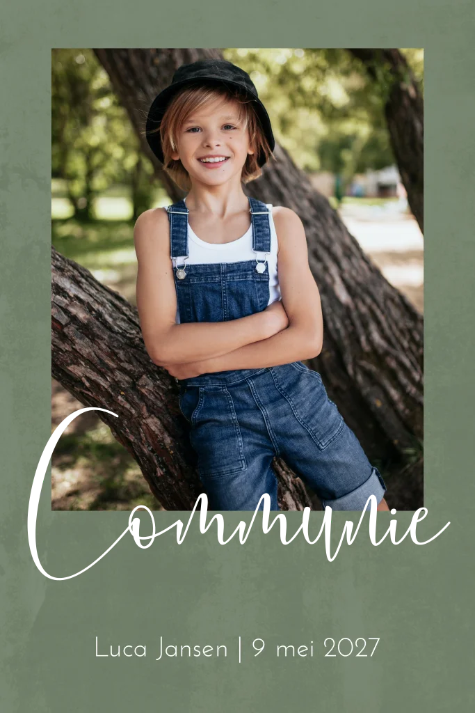 Dit communiekaartje met foto en goudfolie op een groene, velvetlook achtergrond is de perfecte keuze voor deze speciale gelegenheid. Het weelderige groen en het glinsterend goud zorgen voor een unieke uitstraling.