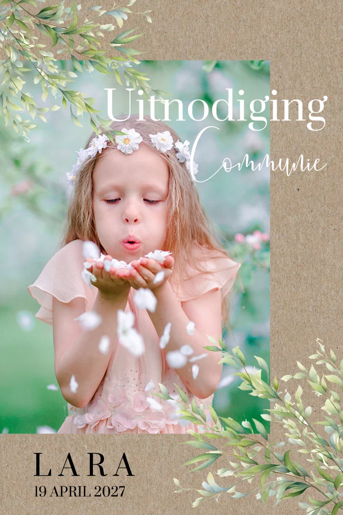 Een mooi communiekaartje met foto en takjes op een kraftlook achtergrond.