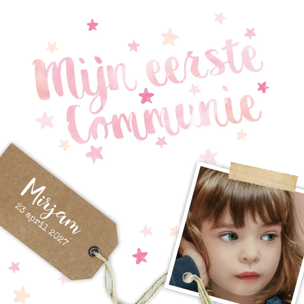 Op zoek naar een hippe uitnodiging voor de eerste communie van jullie dochtertje? Deze kaart is erg feestelijk met roze sterretjes, ruimte voor eigen foto en een label in kraft. Pas de tekst en kleuren naar wens aan in de editor en upload een mooie foto, zo maak je een unieke kaart!