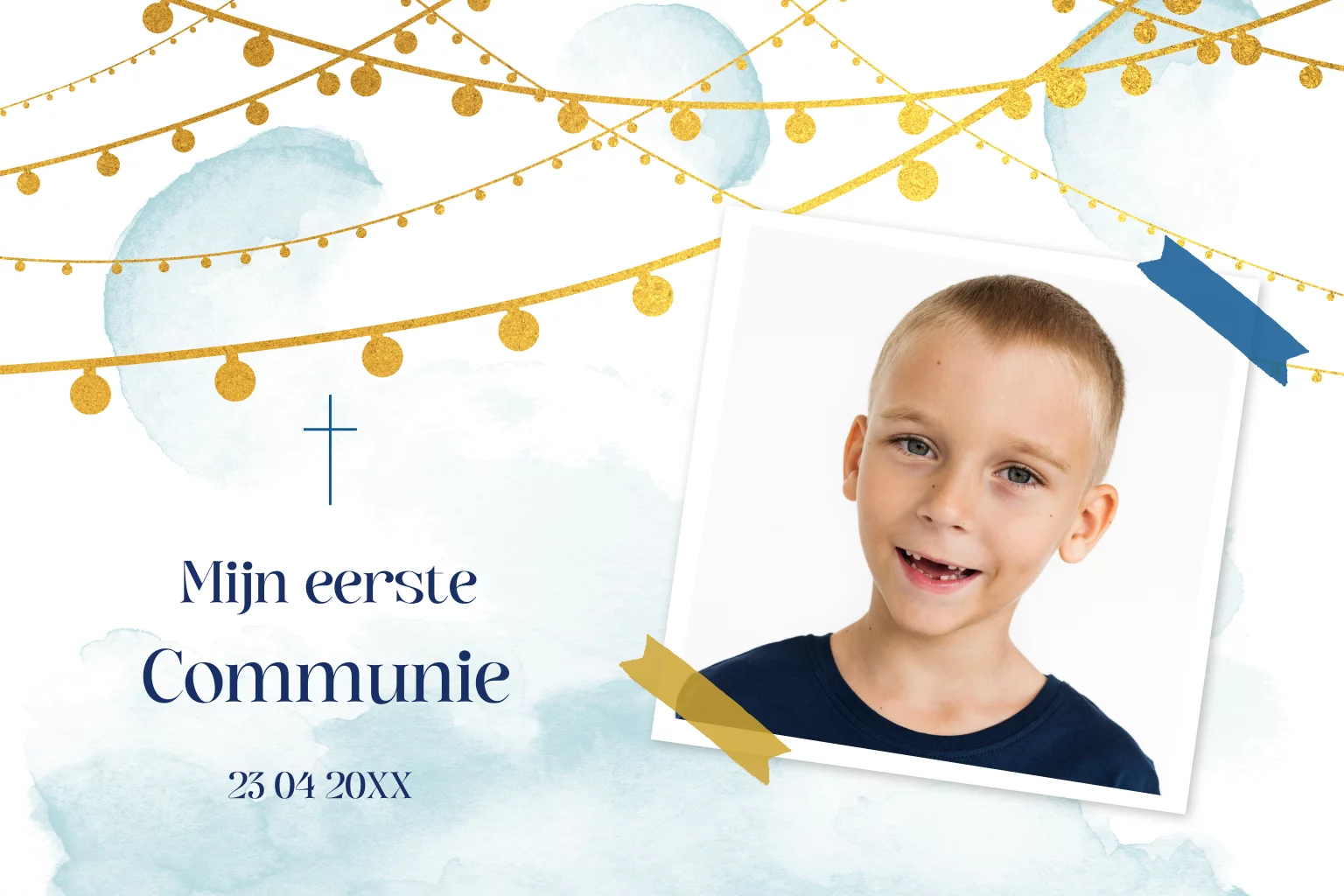 Een toffe uitnodiging voor de eerste communie met een blauwe watercolour achtergrond en goudkleurige lampjesslingers. Op de voorkant kun je een leuke eigen foto plaatsen, ga naar de online editor en maak de kaart naar wens.