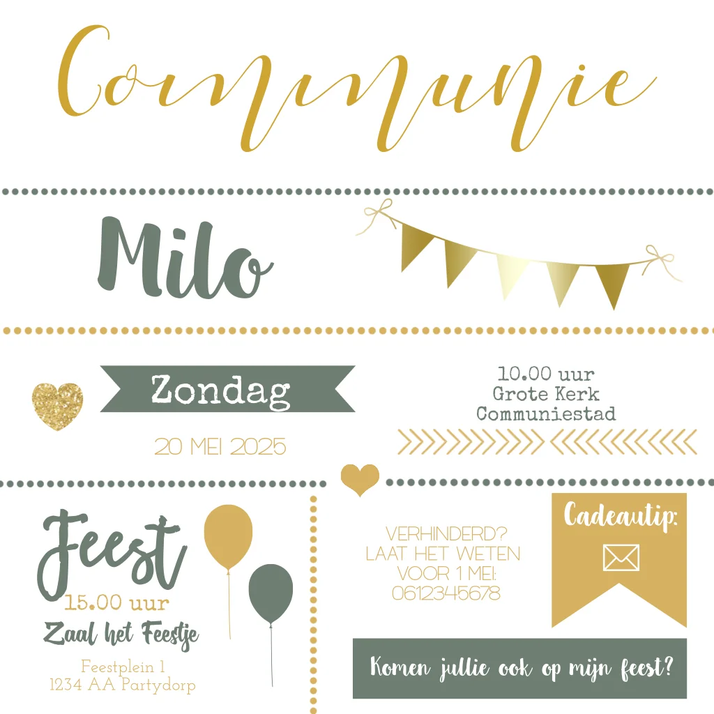 Hippe uitnodiging voor de communie van een jongen met grijze en goudkleurige elementen op een witte achtergrond. Tussen de stippellijnen staat de tekst in verschillende lettertypes. De slingers en ballonnen maken het een feestelijke kaart! De teksten pas je eenvoudig zelf aan in de editor.