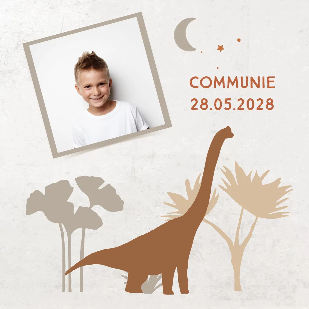 Communiekaart voor een jongen met dino in beige kleur en foto.