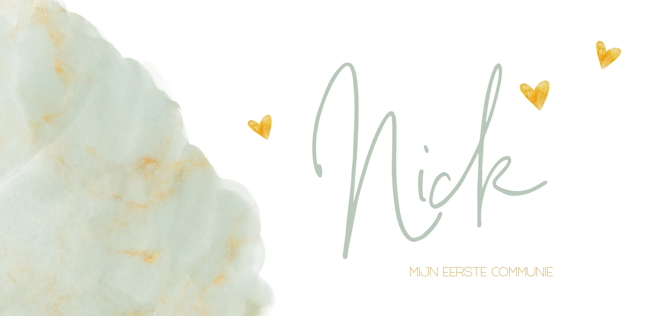 Wat een trendy kaart voor de communie van een jongen! De achtergrond met waterverf en de hartjes in goudlook zijn helemaal van deze tijd. Op de achterkant van deze panoramakaart kun je een leuke foto plaatsen. Pas de tekst en de foto aan in de editor.