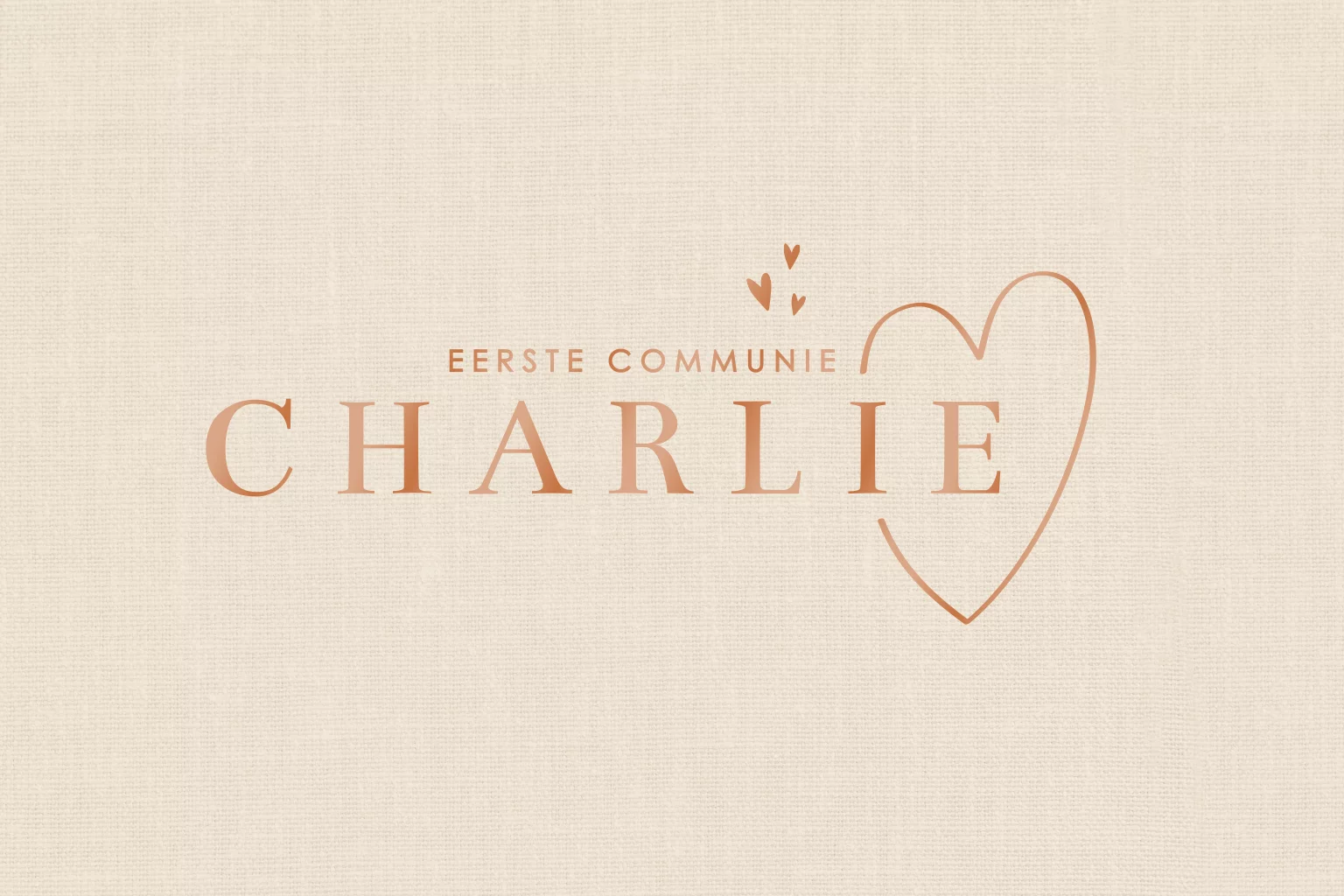 Chique communiekaartje in beige met structuur in de achtergrond. De tekst staat in grote letters in hoogglans met een getekend hart er omheen en kleine hartjes erboven. Pas de tekst eenvoudig zelf aan in de online editor.
