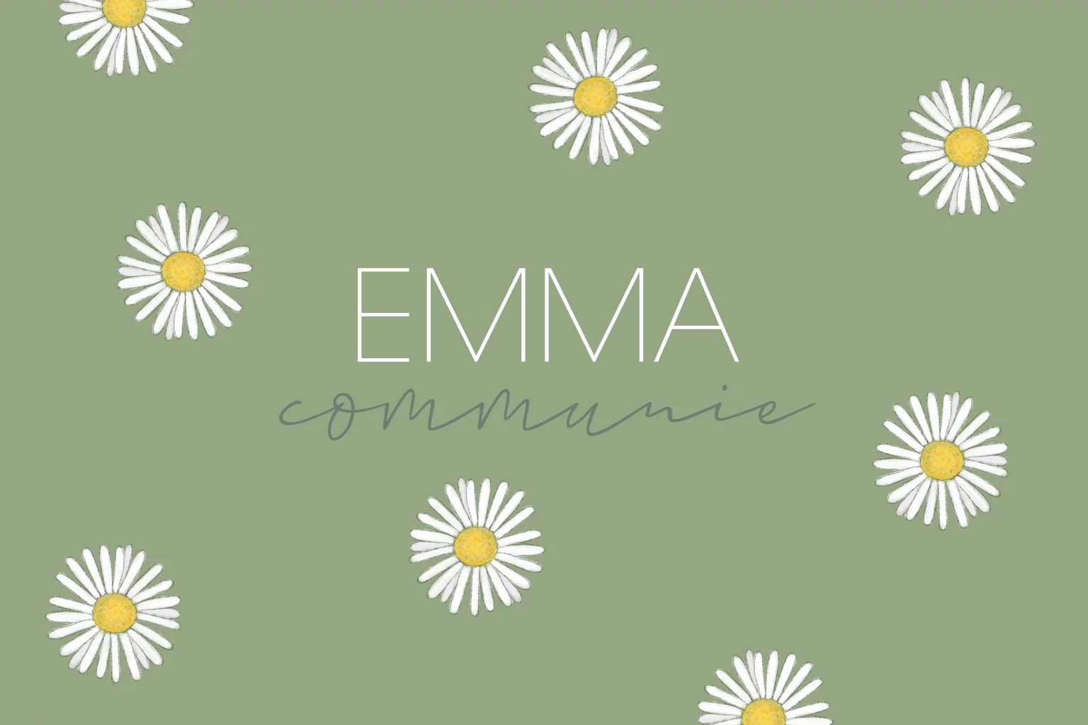 Een vrolijke communiekaart met madeliefjes op een groene achtergrond. De tekst is in goudfolie en kan naar wens worden aangepast in de online editor. De achterkant is wit, ook hier staan weer de leuke madeliefjes, een lief kaartje voor de communie van jullie dochter!