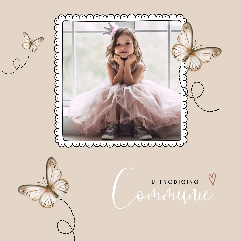 Vrolijke communiekaart met foto op de voorkant en vlindertjes.
