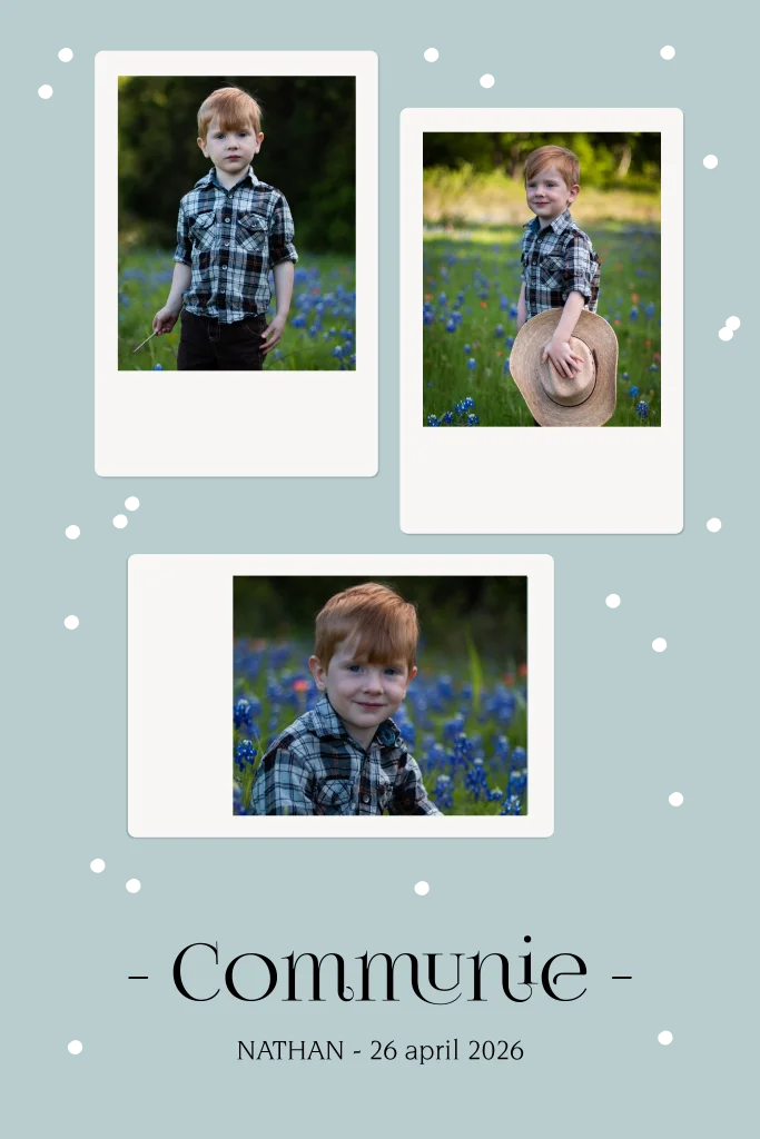 Op zoek naar een uniek communiekaartje om deze speciale gelegenheid te vieren? Dit kaartje is perfect! De polaroids en de gouden confetti geven dit kaartje een unieke uitstraling, maar de blauwe achtergrond maakt het lekker stoer.