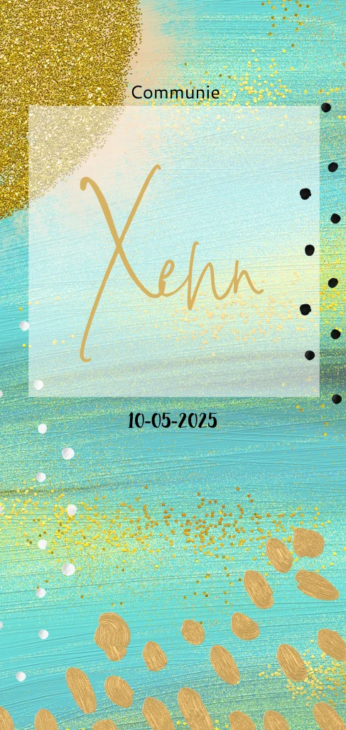 Vrolijke uitnodiging voor de eerste communie van jullie zoontje. Op de abstracte achtergrond in turquoise en goud staat een vierkant met de naam in een trendy lettertype. Liever een andere letter? In de online editor kun je dit eenvoudig zelf aanpassen en maak je het kaartje persoonlijk.