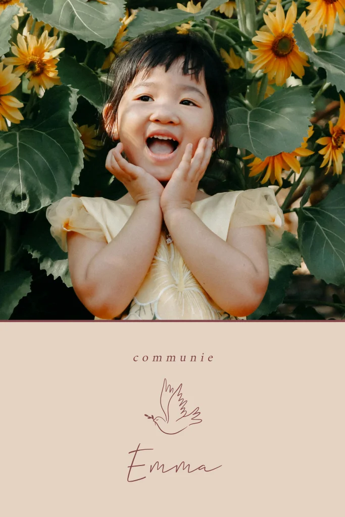 Communiekaartje met foto, roze achtergrond en duif