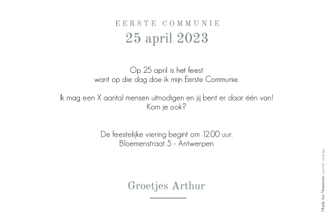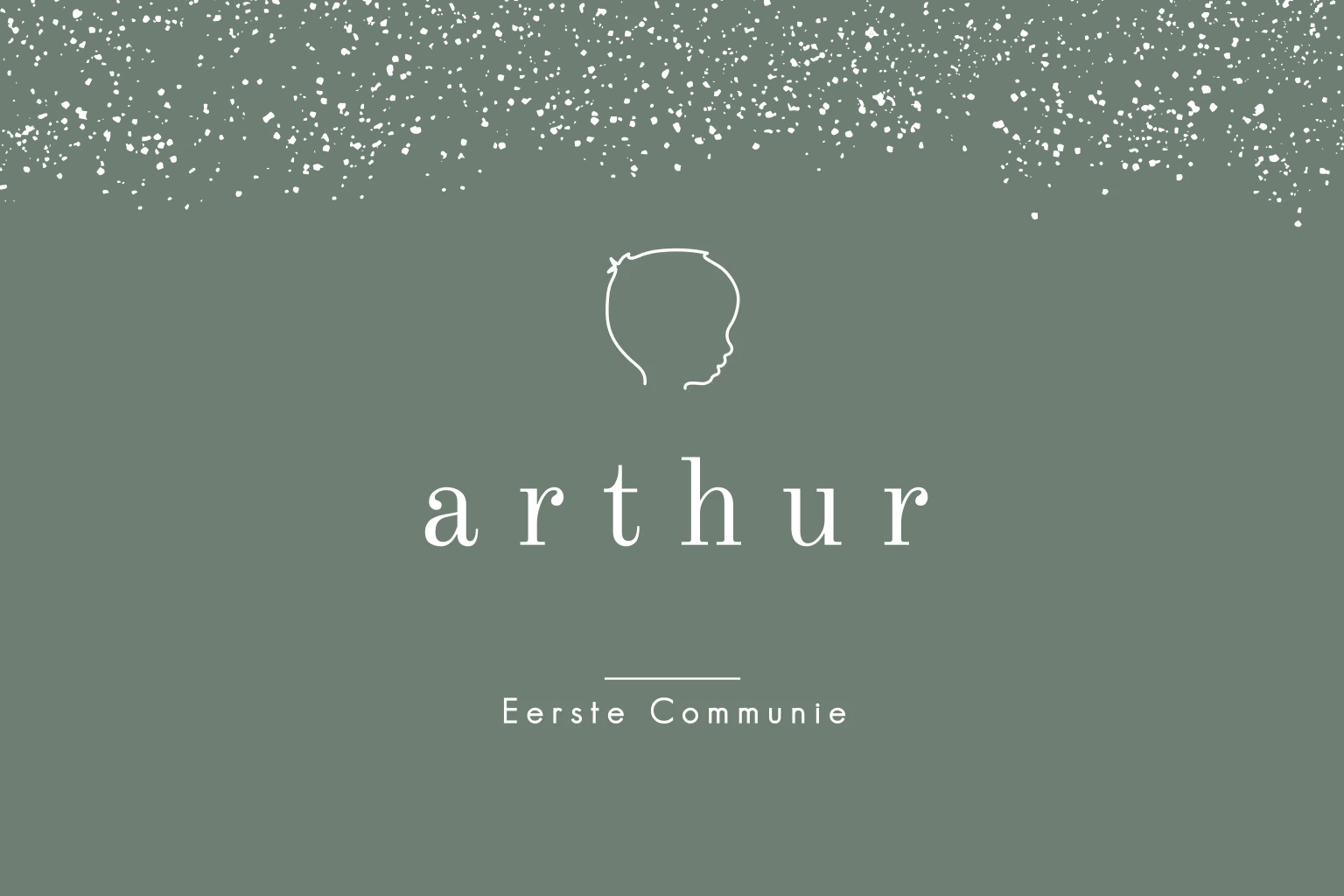 Laat je vrienden en familie weten dat je binnenkort je communie gaat doen door middel van deze stijlvolle uitnodiging met hippe typografie en silhouettekening. Op de olijfgroene achtergrond geven de elementen in goudfolie een chique uitstraling.