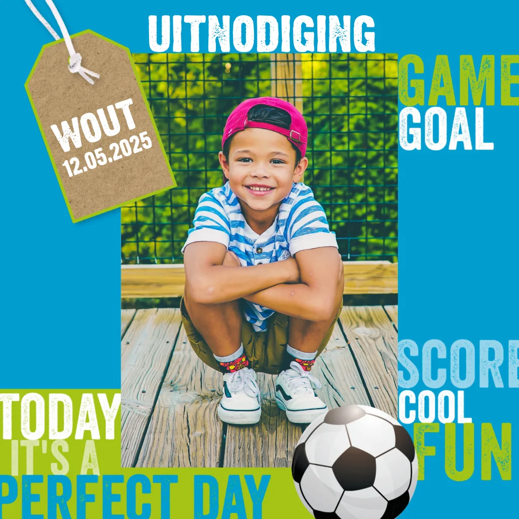 Houdt jullie zoontje ook zo van voetbal? Dan is dit stoere communiekaartje in voetbalthema iets voor hem! In het midden kun je een leuke foto uploaden en op het label in kraftlook zet je de naam en de datum van het lentefeest. Alleen nog de tekst op de achterkant persoonlijk maken in de editor en de kaart is klaar om te versturen!