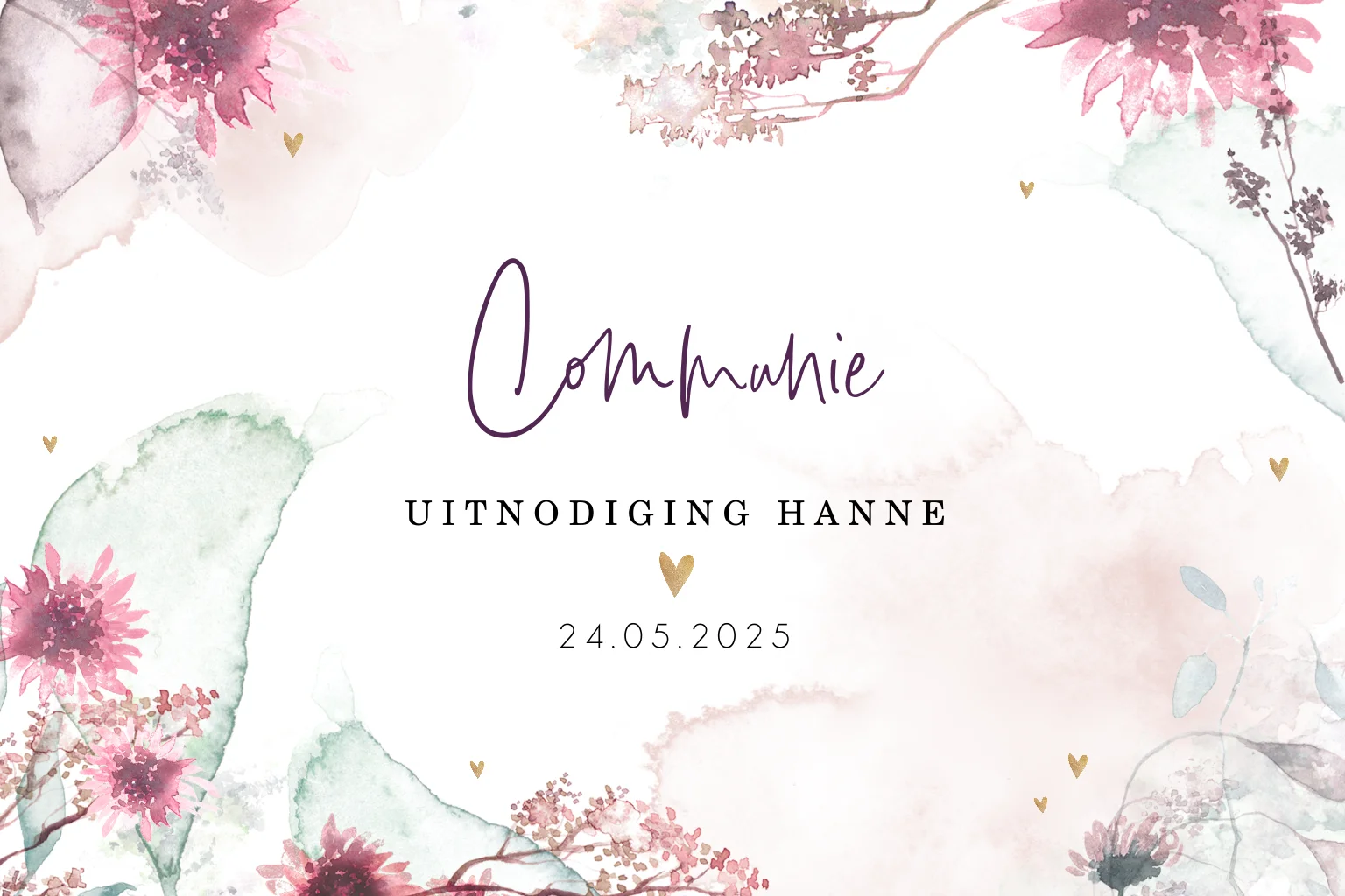Mooie uitnodiging voor de eerste communie van je dochtertje met bloemen in aquarel langs de rand in roze en groen. Met speelse typografie maak je het kaartje helemaal van nu, pas het eenvoudig aan naar eigen smaak in de online editor.