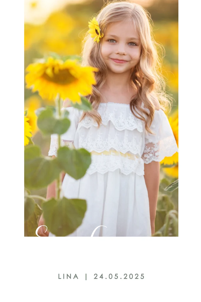 Een communiekaartje voor een meisje met op de voorkant met goudfolie 'eerste communie' en ruimte voor eigen foto. Het kaartje is helemaal naar wens aan te passen in de online editor.
