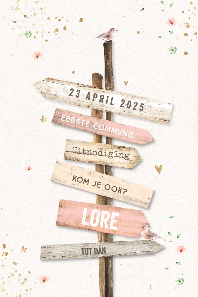 Lieve uitnodiging voor de communie van een meisje. Op het kaartje staat een strandpaal met wegwijzers en een vogeltje erop, op de achtergrond gekleurde bloemetjes en hartjes in roze tinten. Het kaartje is helemaal naar wens aan te passen in de online editor.