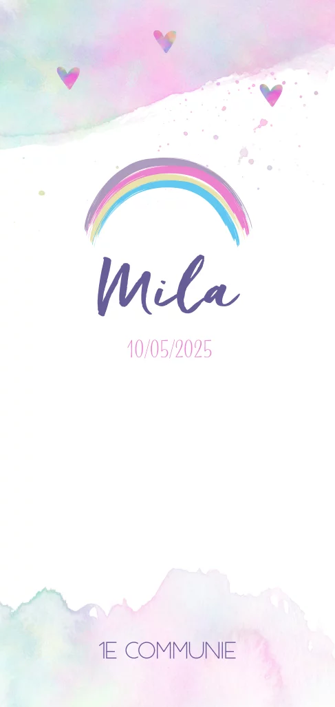 Trendy communiekaart voor een meisje met regenboog en watercolour in vrolijke kleuren. Door de hartjes krijgt deze kaart een lieve uitstraling. Pas de tekst aan in de editor en kies lettertype en kleur naar wens.