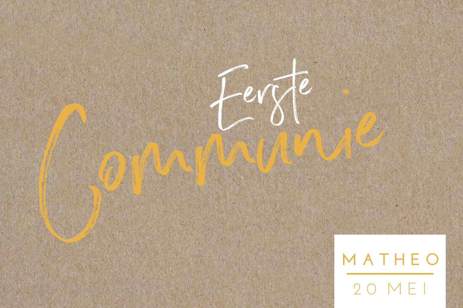 Stoere uitnodiging eerste communie op kraftpapier met okergeel en witte letters, persoonlijk te maken met een eigen ontwerp.