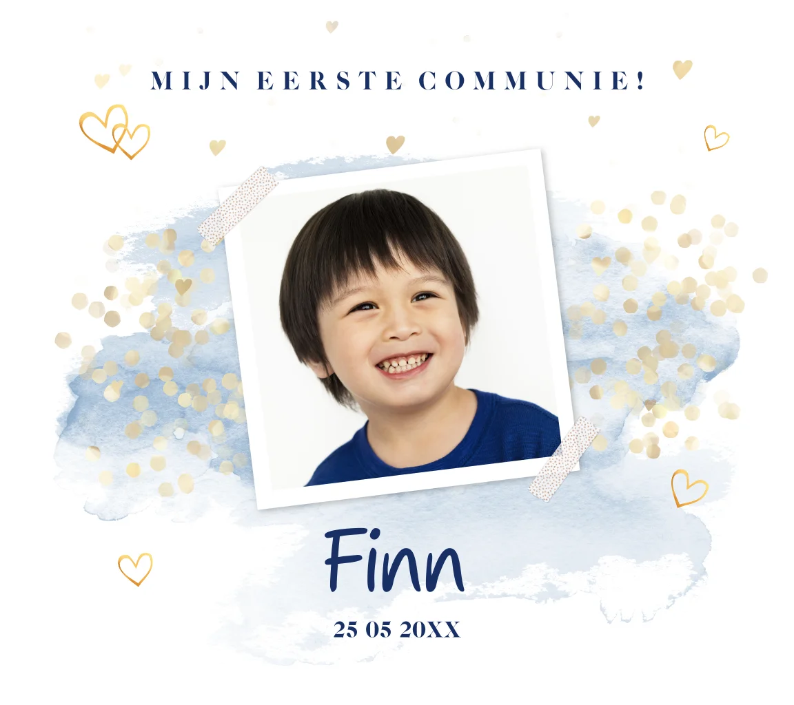 Een mooie uitnodiging voor communie of vormsel, plaats zelf een leuke foto van jullie zoon of dochter en pas de kleuren aan. Op deze kaart staan goudkleurige confetti, hartjes en waterverf op de achtergrond.