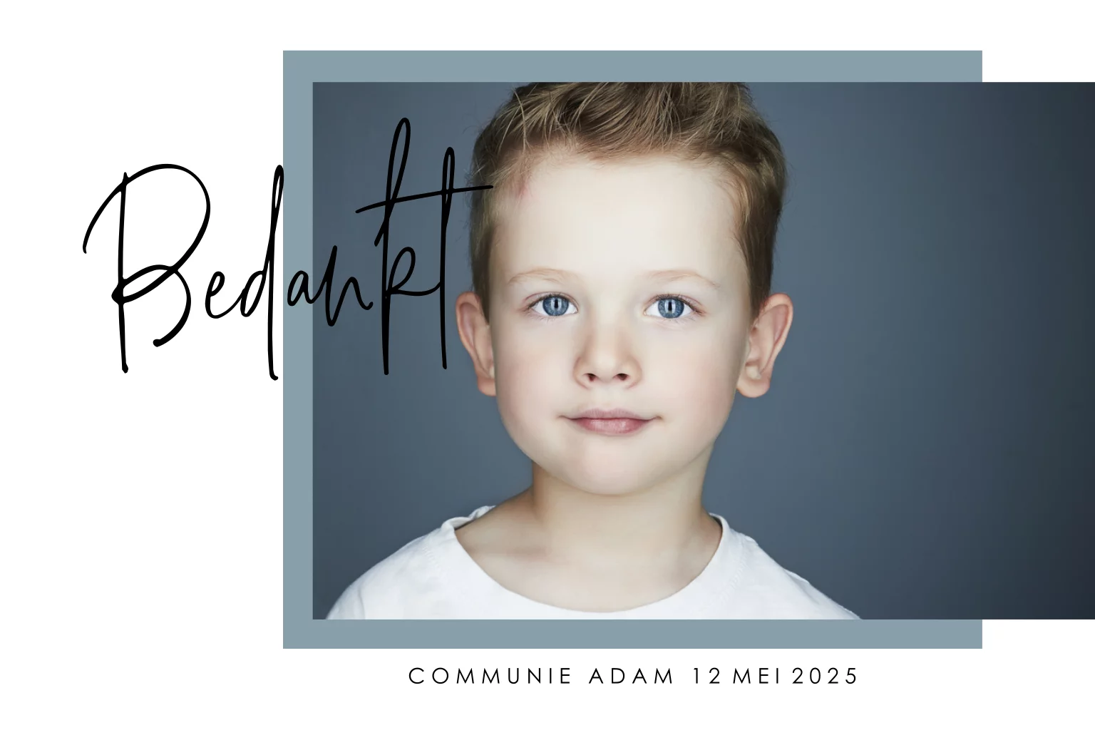 Bedankkaart communie liggend model. Stoere witte kaart met blauw kleurvlak onder de foto en hippe letters, aan te passen naar eigen ontwerp.
