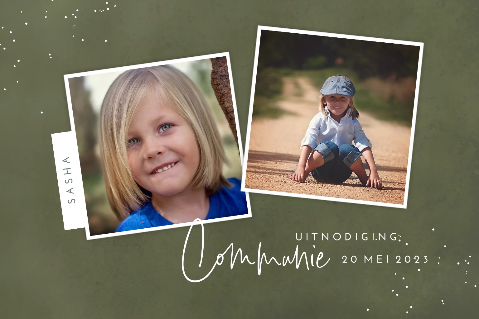 Goudfolie communiekaart met foto's op donkergroen