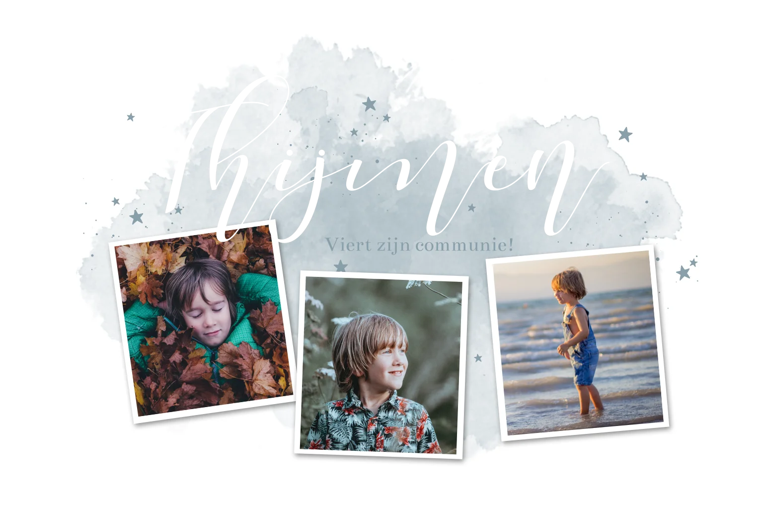 Hippe uitnodiging voor de communie van jullie zoon. De naam staat in goudfolie op een vlak met blauwe watercolour en kleine blauwe sterretjes op de achtergrond. Op de voorkant kun je drie foto's uploaden. Maak je kaart persoonlijk, dit doe je eenvoudig in de online editor.