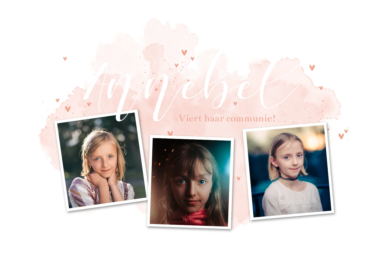 Een hip communiekaartje met goudfolie typografie en roze watercolour. Eromheen staan lieve roze hartjes. Op de voorkant kun je drie leuke foto's uploaden! Pas de tekst eenvoudig naar eigen wens aan in de online editor.