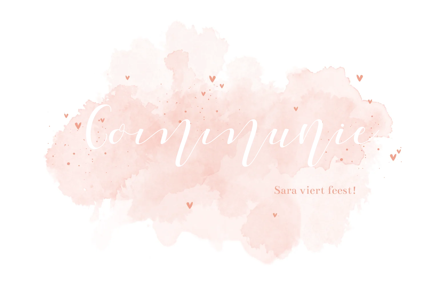 De eerste communie is een speciale gebeurtenis voor jullie en voor jullie dochtertje. Laat het iedereen weten door middel van deze lieve kaart met kleine hartjes. De roze watercolor achtergrond is ontzettend schattig en is prachtig gecombineerd met de goudfolie letters, die het communiekaartje een echte luxe uitstraling geven.