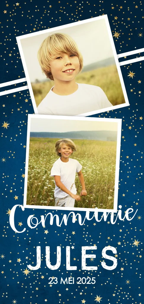 Langwerpige communie kaart met gouden sterren en tekst in goudfolie op een donkerblauwe achtergrond. Op de voor- en achterkant kun je zelf foto's toevoegen. In de online editor maak je dit kaartje eenvoudig helemaal naar eigen wens.