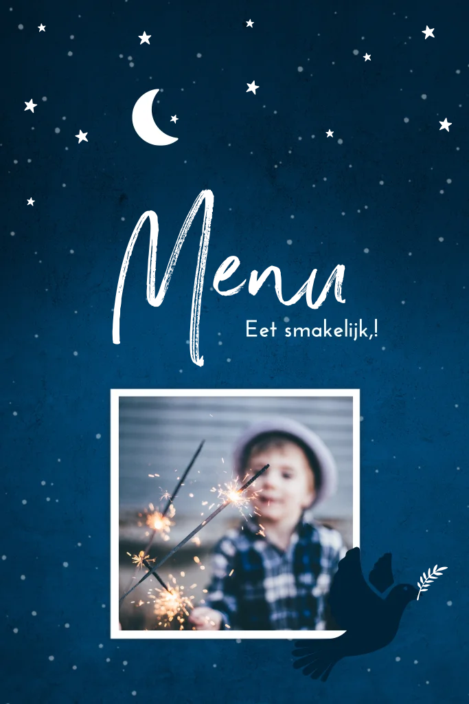 Een nachtblauwe achtergrond met de maan, een duif met takje, en sterretjes en letters in goudfolie maken dit een mooie menukaart voor een communie. Voeg in het witte kader een eigen foto toe. Het menu staat op de achterkant van het kaartje en de tekst is eenvoudig zelf aan te passen in de online editor.