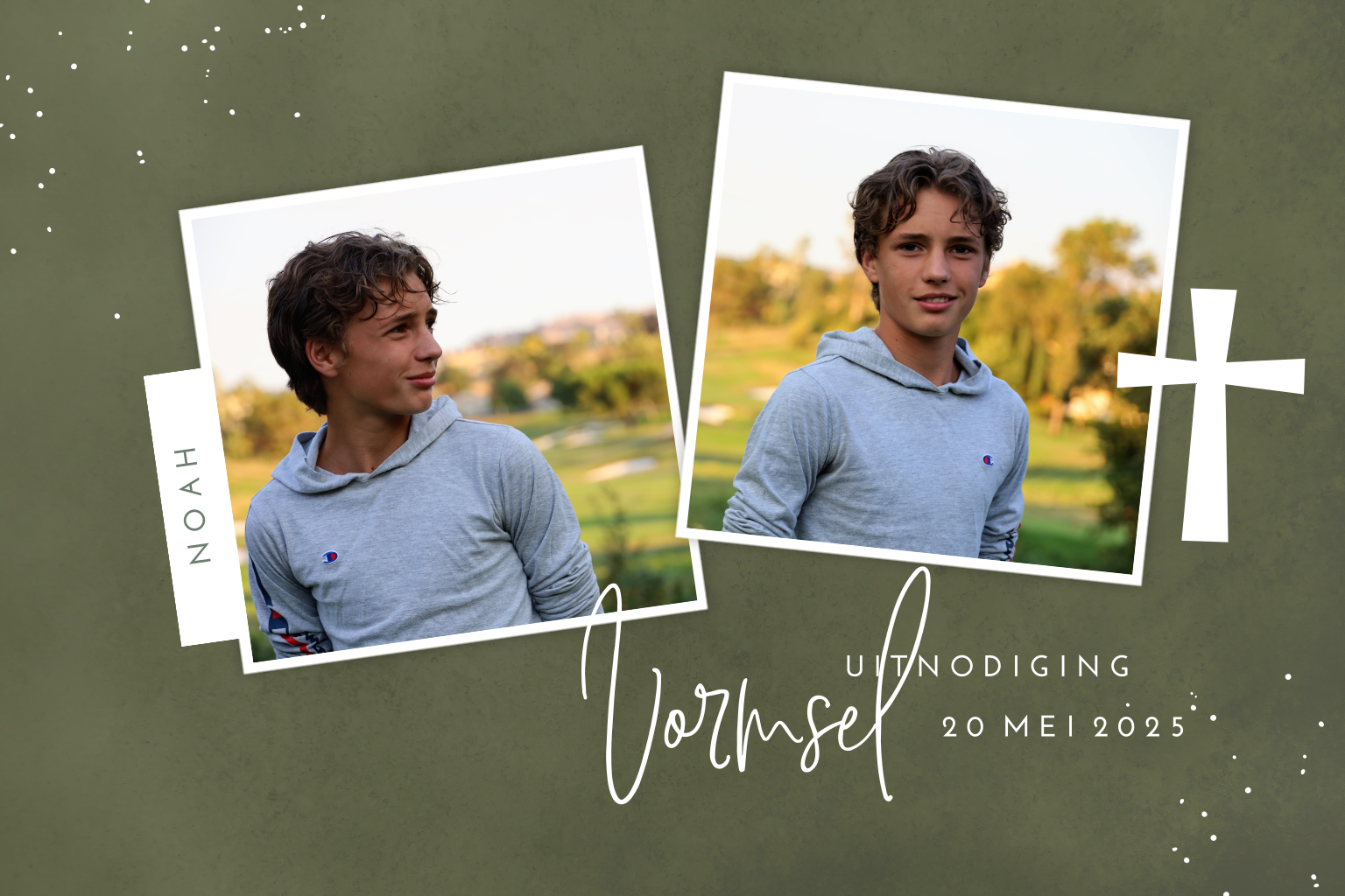 Stoere uitnodiging voor de vormsel van jullie kind! Op deze kaart is er ruimte voor twee foto's. De kruis en de tekst "vormsel" in goudfolie geven een luxe uitstraling aan deze uitnodiging.