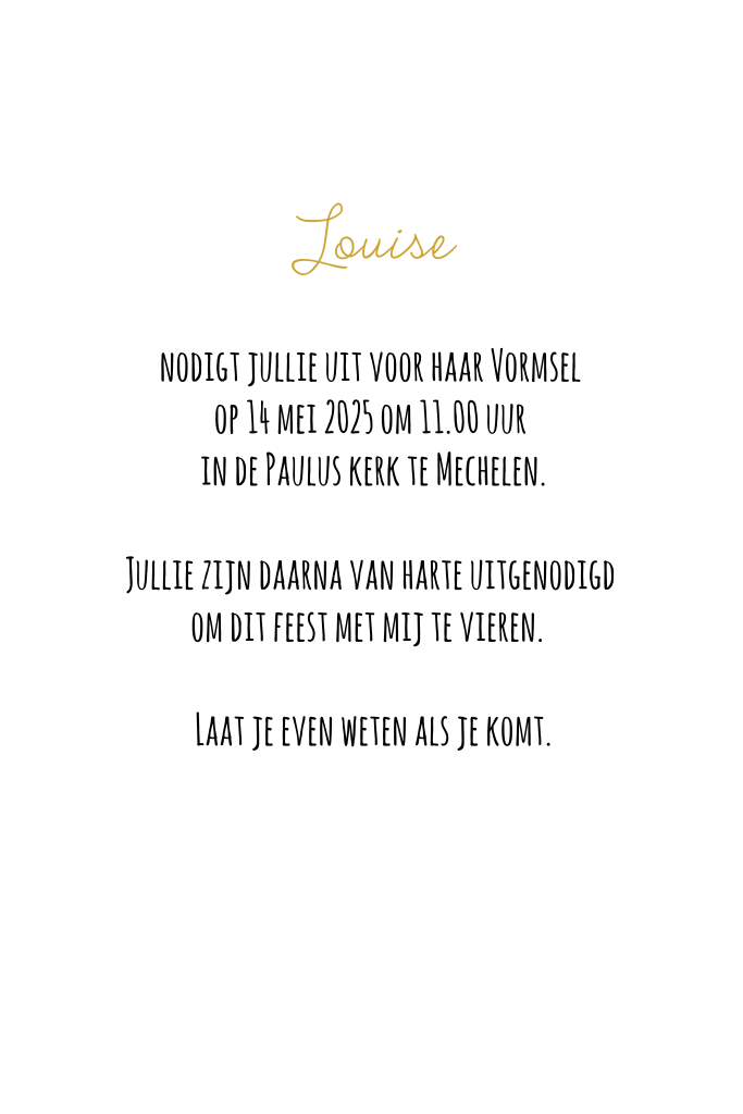 Een klassieke vormsel uitnodiging met goudfolie en ruimte voor een eigen foto. In onze online editor kun je de tekst personaliseren en naar wens extra versieringen en symbolen toevoegen.