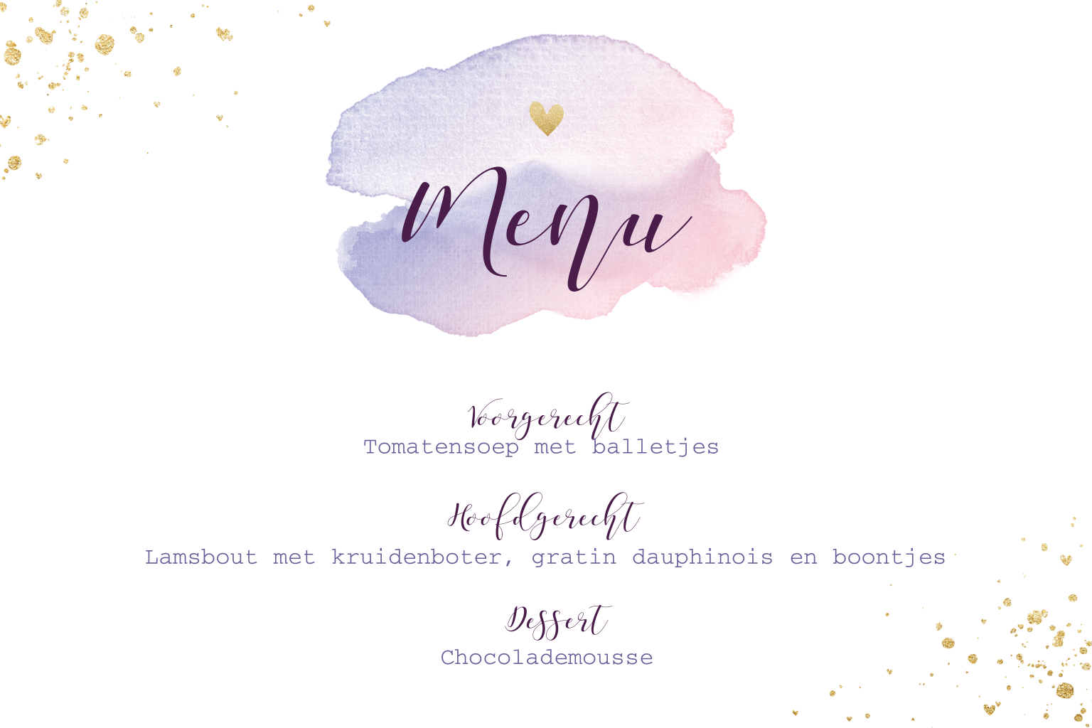 Trendy menukaart voor de communie van een meisje. Op de voorkant een wolk van paars en roze watercolour met een goudkleurig hartje boven de tekst. De goudspetters in de hoeken zorgen voor een feestelijke touch. Aan de binnenzijde is ruimte voor een eigen foto en de tekst voor het menu, pas de kaart zelf eenvoudig aan in de online editor.