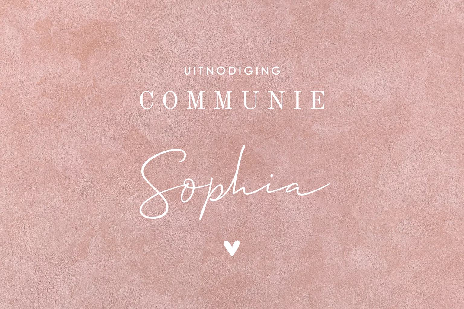 Hippe uitnodiging voor de communie van een meisje in oudroze velvet look. De tekst staat in verschillende lettertypes in roségoudfolie voor een extra luxe effect. Pas de kaart naar wens aan in onze online editor.