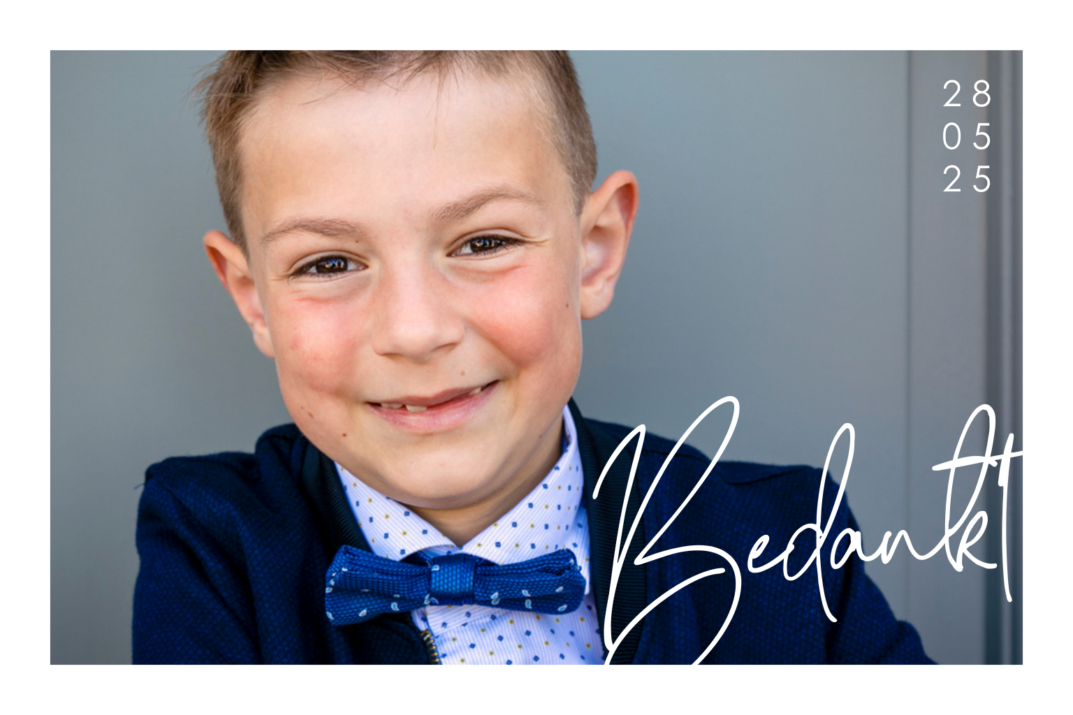 Maak een persoonlijk bedankkaartje voor de communie met dit liggende witte kaartje. Op de voorkant kun je een leuke foto uploaden in de online editor, de tekst in goudfolie maakt het extra mooi!