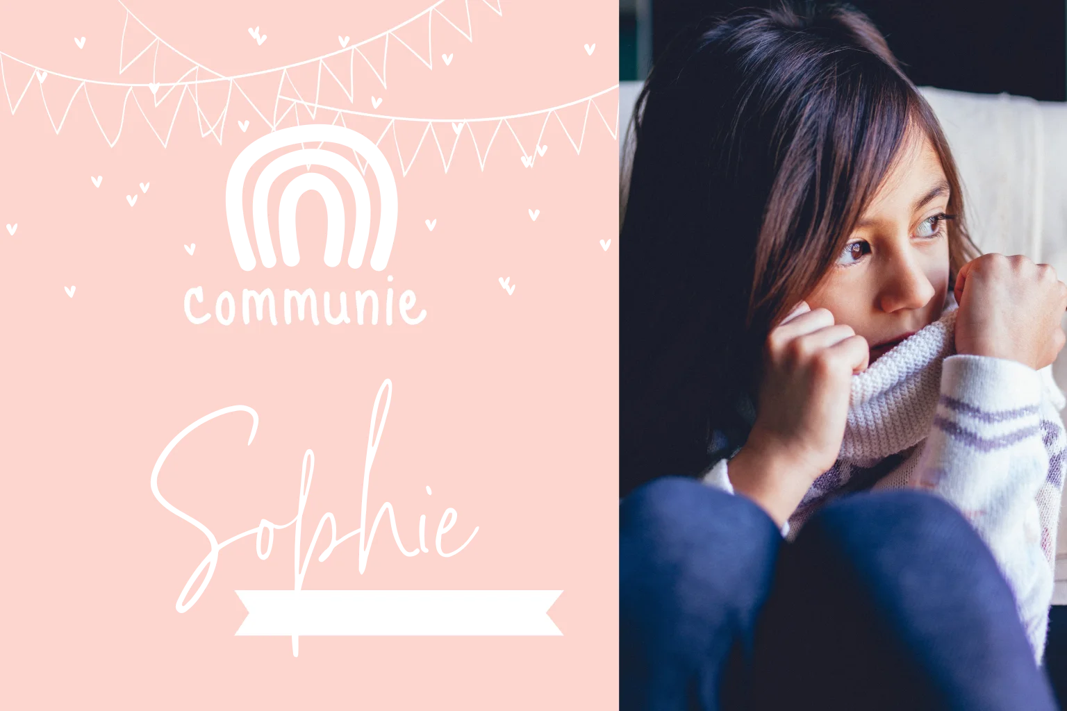 Een lieve roze communiekaart voor een meisje met een getekende witte slinger en ruimte om foto's te plaatsen op de voor- en achterzijde. De regenboog, hartjes en de naam zijn in roségoudfolie gedrukt, dat geeft een feestelijke look.