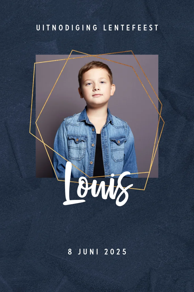 Moderne uitnodiging voor het lentefeest van een jongen! Deze kaart heeft een mooie blauwe velvet-look achtergrond en heeft ruimte voor een eigen foto. De geometrische lijnen maken deze uitnodiging helemaal af!