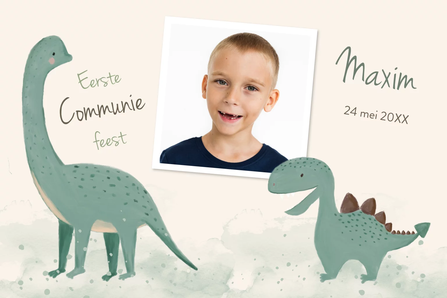 Is jullie zoontje ook gek op dino's? Dan is dit de perfecte uitnodiging voor een communiefeest. Op de voorkant staan twee zeegroene dino's op een crèmekleurige achtergrond met groene waterverf. In het fotokader kun je een eigen foto uploaden in de online editor. Op de witte achterzijde staat ook nog een leuke dino naast de uitnodigingstekst.