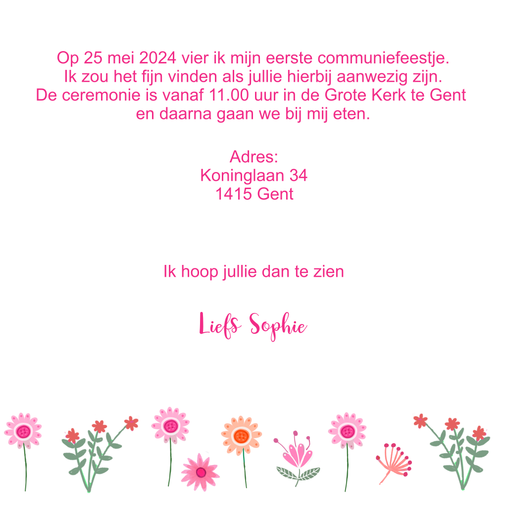 Hippe uitnodigingskaart voor de communie voor een meisje met kleurrijke illustraties van roze, oranje bloemetjes en een flamingo. In het ronde kader kun je een mooie foto plaatsen. Dit doe je zelf in de online editor.
