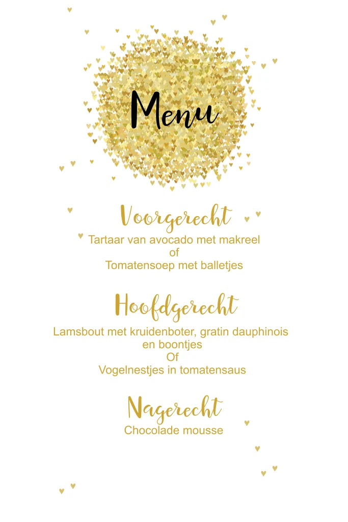 Een feestelijke menukaart voor communie met een cirkel van gouden glitterhartjes op een witte achtergrond. De tekst staat in een trendy lettertype in het goud. Pas het menu gemakkelijk zelf aan in de online editor, zo gedaan!